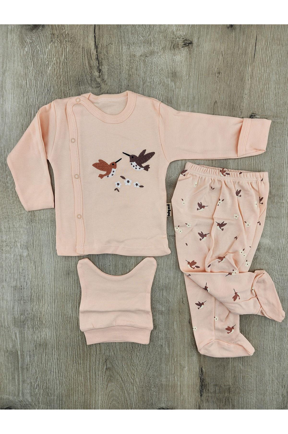 Babycan 9413 Çiçekli Kuş Desenli Kendinden Eldivenli Şapkalı Zıbın Takımı