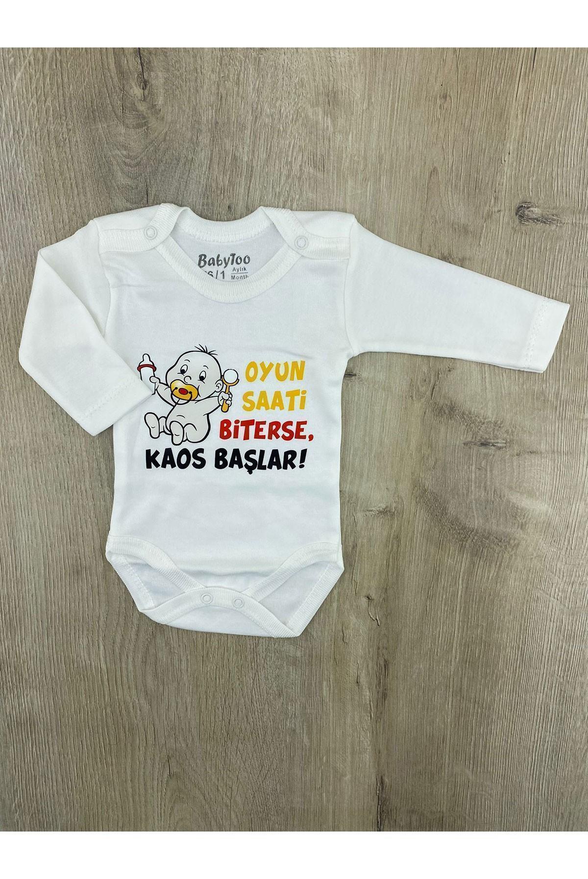 Babytoo (0-36 Ay) OYUN SAATİ BİTERSE KAOS BAŞLAR Desenli Uzunkollu Çıtçıtlı Badi (P-00000006719)