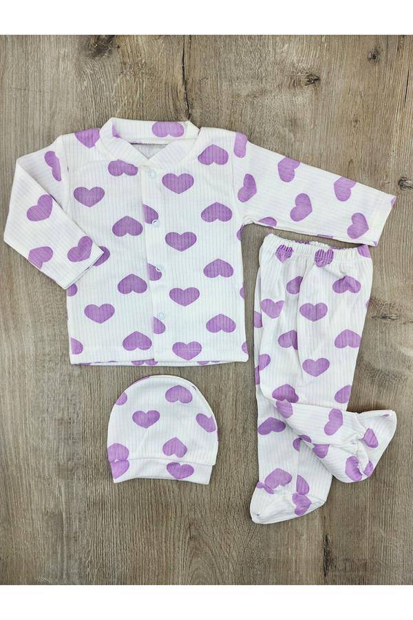 Özlev (0-3 Ay) Büyük Kalp Desenli Şapkalı Zıbın Takımı